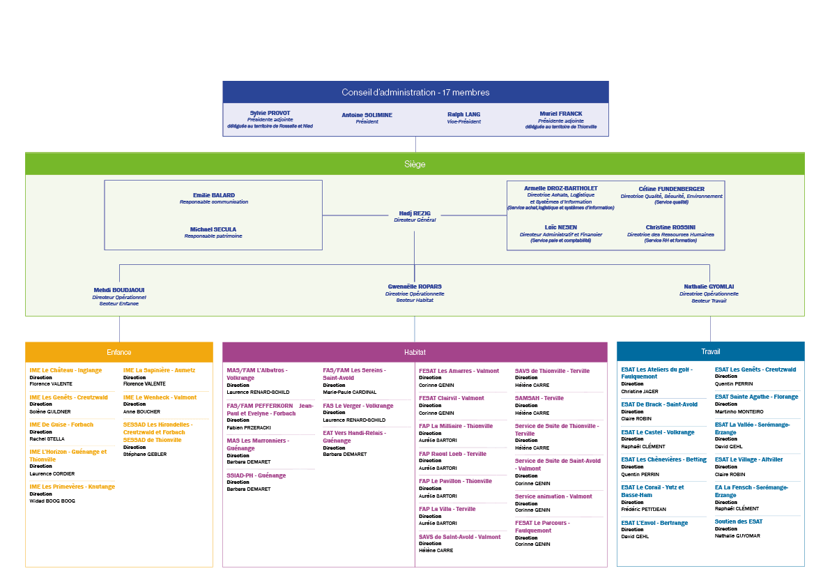 - Les trois directions opérationnelles en charge des secteurs enfance / habitat (2 pôles : habitat et accompagnement spécialisé / habitat et vie sociale) et travail , auxquelles sont rattachés tous les directeurs d'établissements et de services,