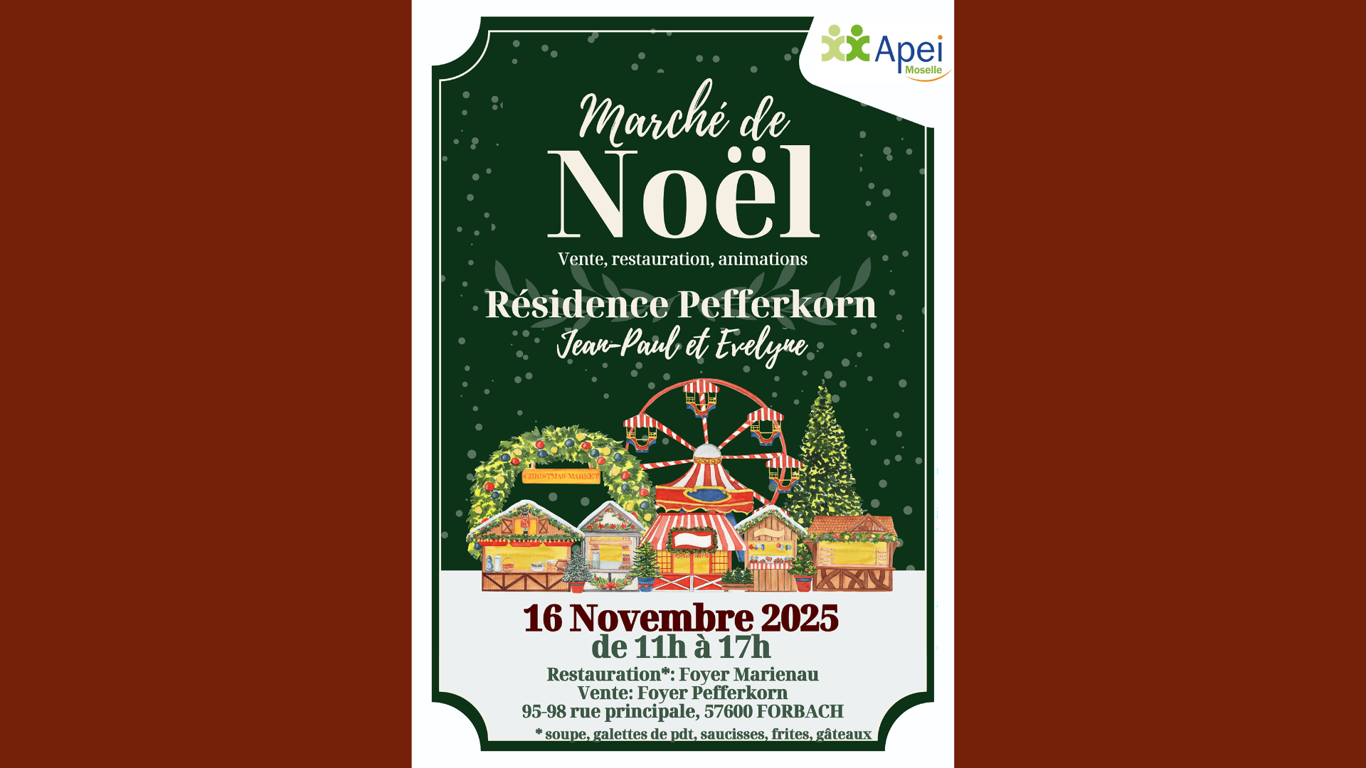 𝐌𝐚𝐫𝐜𝐡𝐞́ 𝐝𝐞 𝐍𝐨𝐞̈𝐥 𝐝𝐞 𝐥𝐚 𝐑𝐞́𝐬𝐢𝐝𝐞𝐧𝐜𝐞 𝐏𝐞𝐟𝐟𝐞𝐫𝐤𝐨𝐫𝐧 – 𝐉𝐞𝐚𝐧-𝐏𝐚𝐮𝐥 𝐞𝐭 𝐄𝐯𝐞𝐥𝐲𝐧𝐞L'ensemble des résidents et les professionnels du FAS/FAM Pefferkorn ont le plaisir de vous inviter à leur traditionnel Marché de Noël, le dimanche 16 novembre 2025, de 11h à 17h !