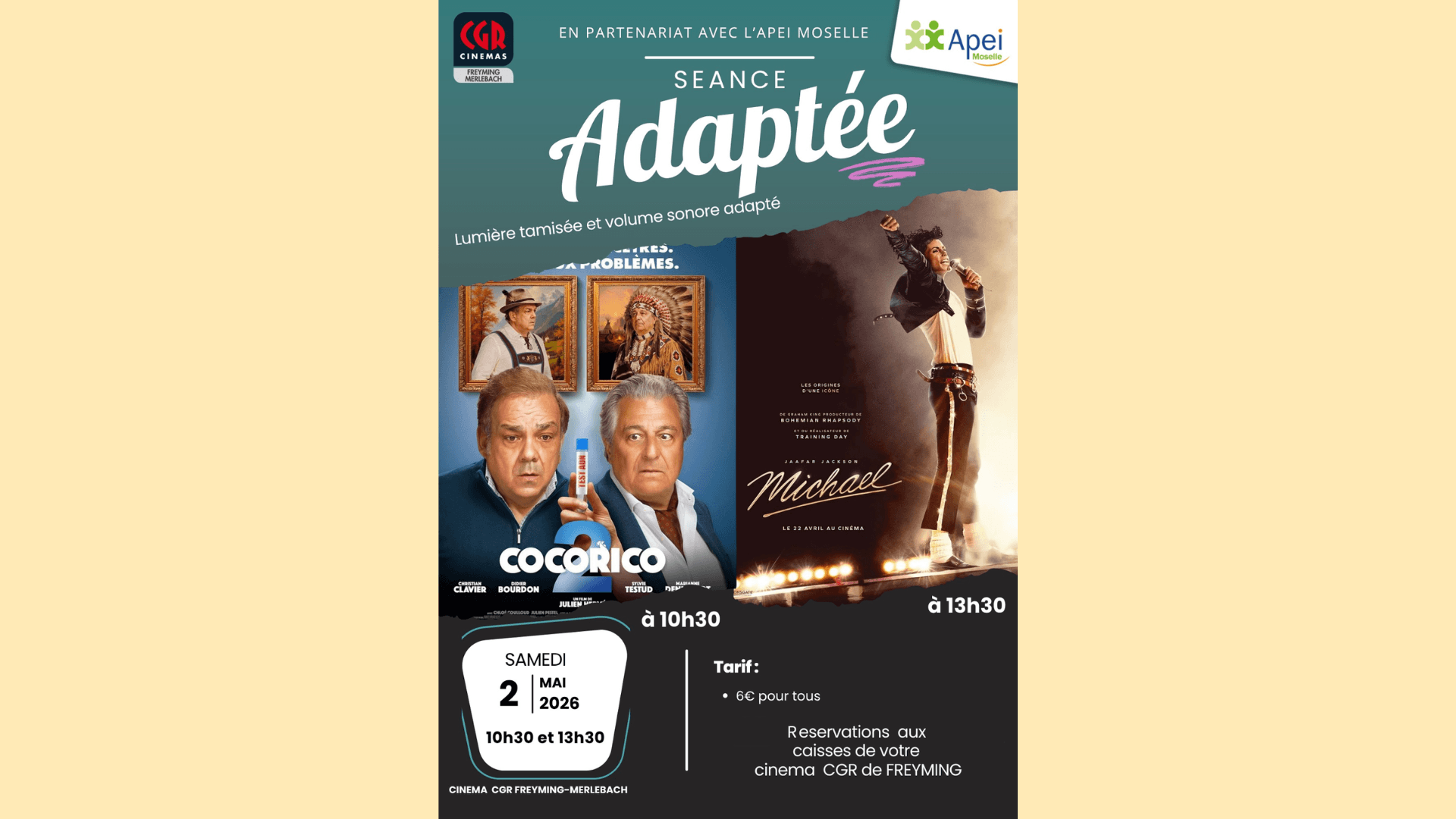 Le Comité Local de la Vie Associative de Rosselle et Nied, en partenariat avec le CGR de Freyming Merlebach, vous propose deux séances de cinéma adaptées le ️ samedi 2 mai 2026 ️ :