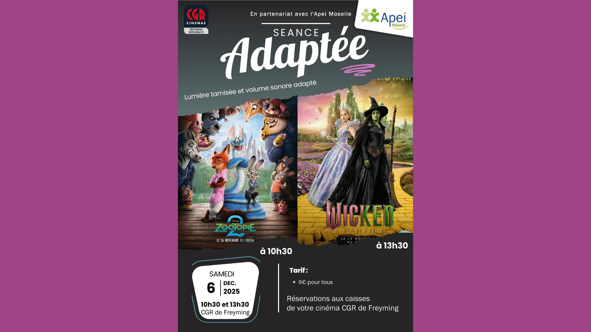 Le Comité Local de la Vie Associative de Rosselle et Nied, en partenariat avec le CGR de Freyming Merlebach, vous propose deux séances de cinéma adaptées le ️ samedi 6 décembre 2025 ️ :