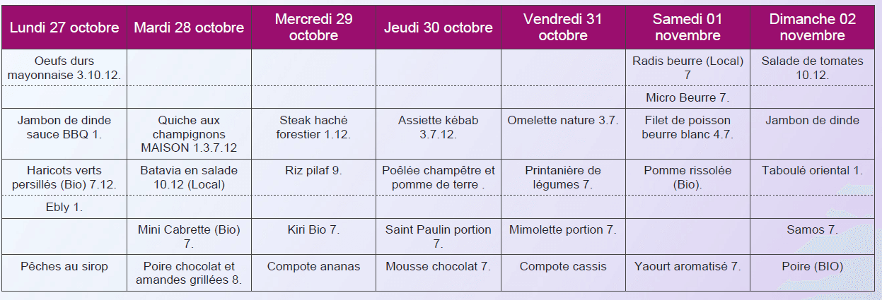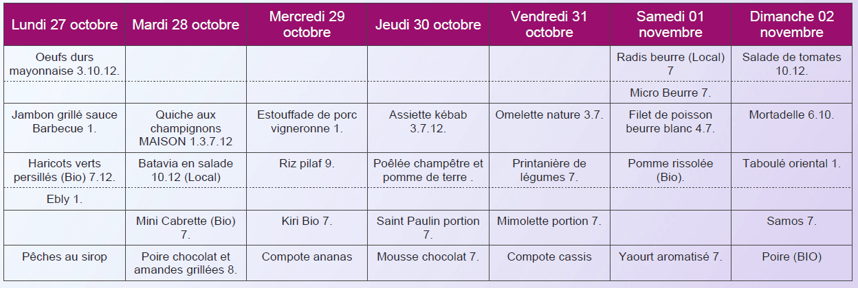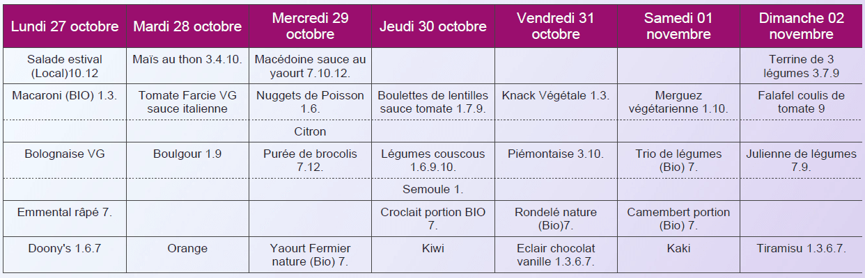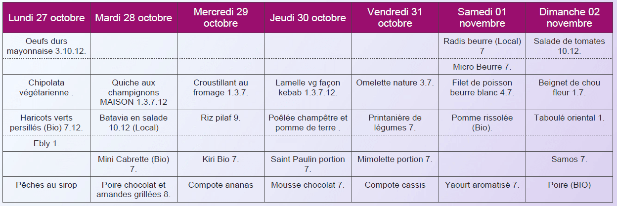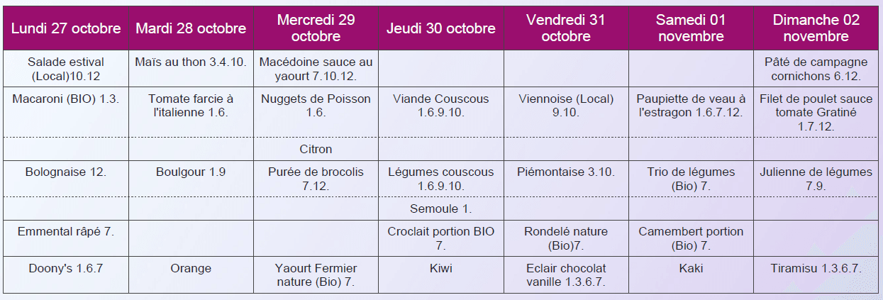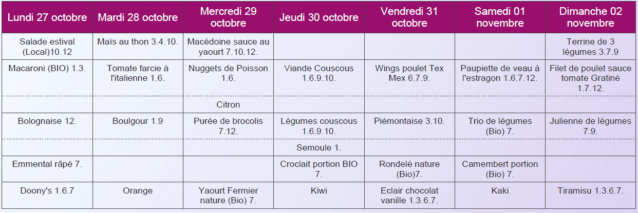 Menus de la semaine du 27 octobre au 2 novembre 2025